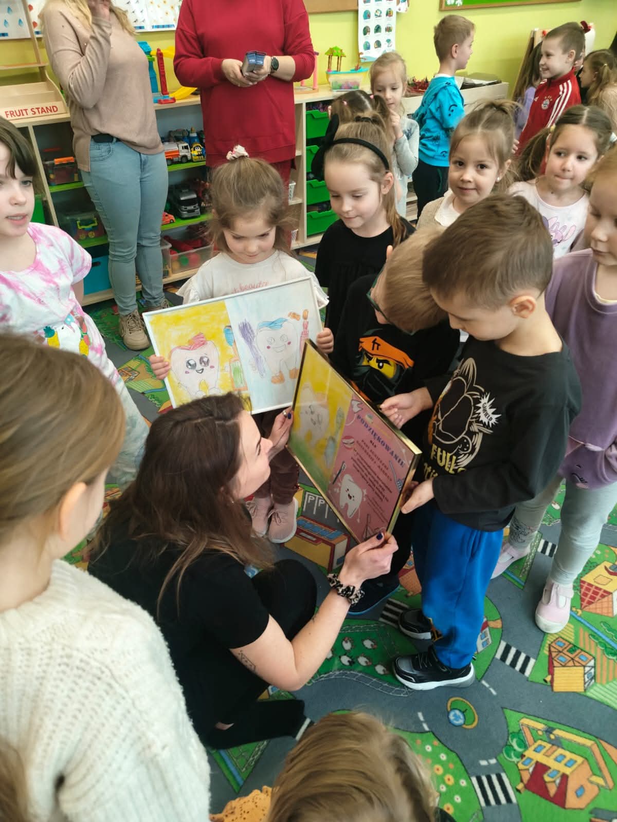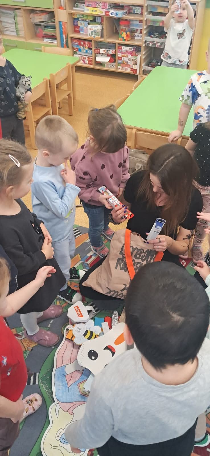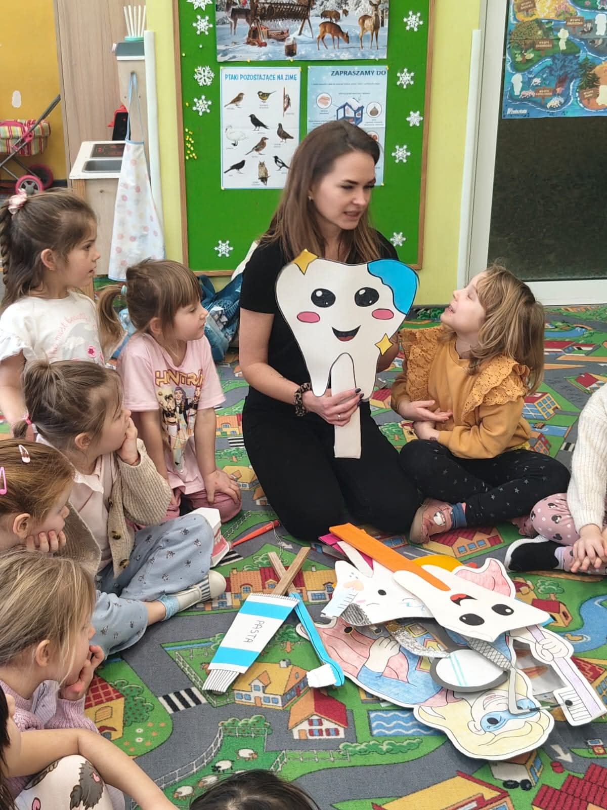 Dzisiaj nasze przedszkolaki odwiedził wyjątkowy gość – Pani stomatolog Agnieszka Kozubska-Markus, która przeprowadziła dla dzieci fantastyczne warsztaty stomatologiczne! Dzięki temu spotkaniu wizyta u dentysty nie będzie już budzić lęku, a dbanie o ząbki stanie się dla maluchów codzienną, radosną przygodą. Podczas warsztatów nasze przedszkolaki: Dowiedziały się, jak prawidłowo szczotkować zęby, by lśniły jak perły – trening na modelach szczęk sprawił im mnóstwo frajdy! Poznały listę „przyjaciół” i „wrogów” zdrowego uśmiechu – teraz już każdy wie, dlaczego jabłuszko jest lepszym wyborem niż cukierek. Na zakończenie spotkania Pani doktor przygotowała dla wszystkich niespodziankę – każde dziecko otrzymało w prezencie własną szczoteczkę do zębów! To był wspaniały gest, który od razu zmotywował maluchy do testowania zdobytej wiedzy w praktyce.